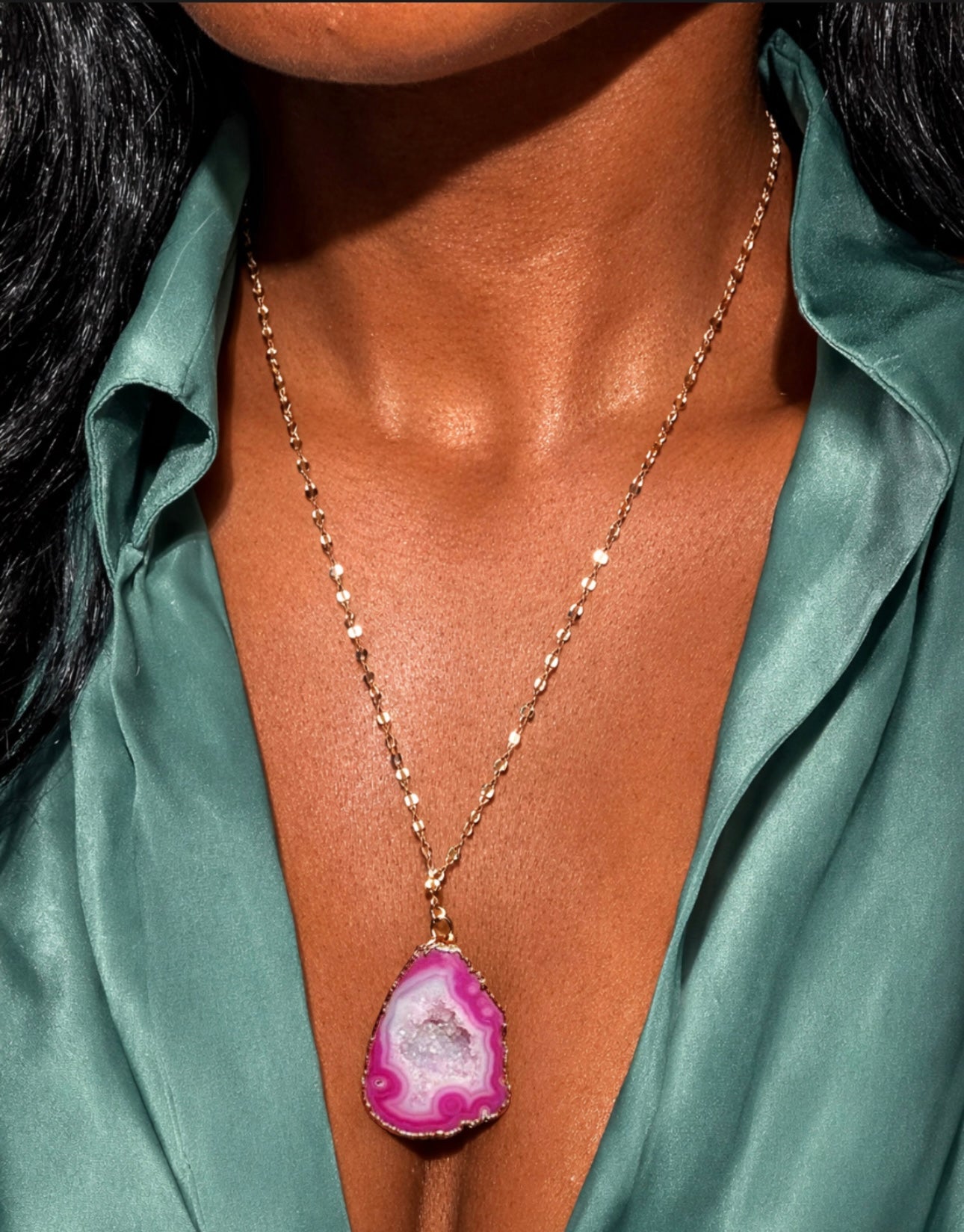 This geode quartz necklace is a captivating blend of nature's beauty and modern design. The striking geode pendant showcases shimmering quartz crystals encased in a vibrant fuchsia hue, making it a perfect conversation starter. Elevate your look with this one-of-a-kind piece, adding a bold touch of color and texture to any ensemble.