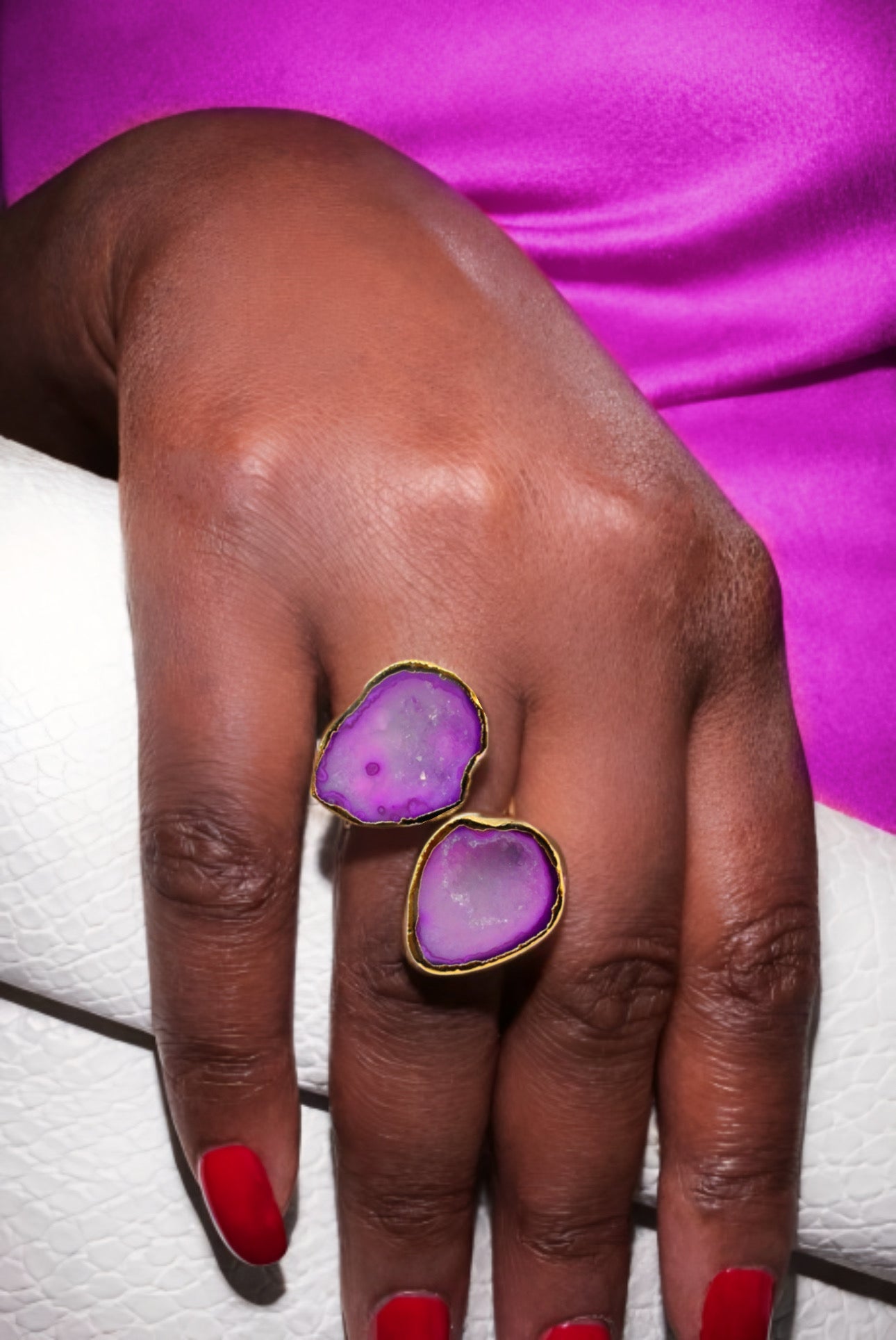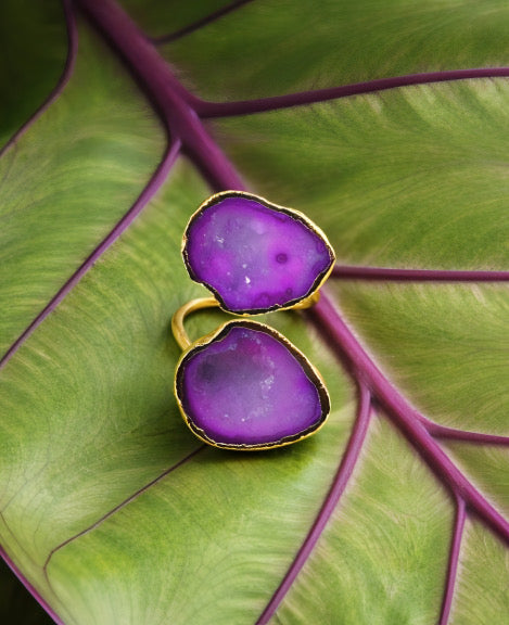 This pink geode ring is a radiant blend of softness and statement, featuring two luminous crystal slices wrapped in rich gold. Gradients of vivid fuchsia melt into delicate blush tones, creating a dreamy, watercolor-like effect with subtle natural sparkle at the center. Bold yet romantic, this sculptural piece adds a vibrant pop of color and effortless glamour to any look.