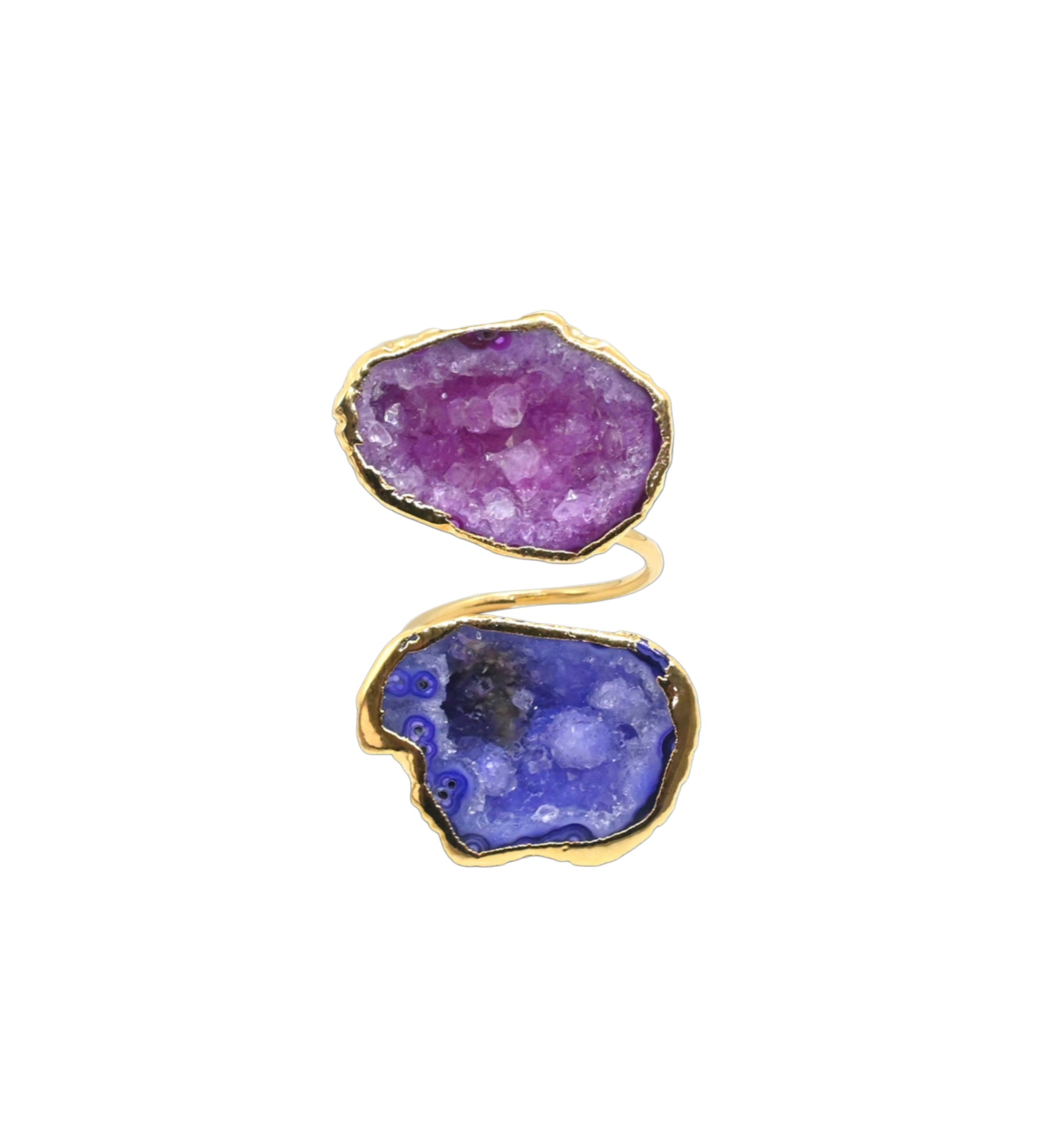 This purple and pink geode ring is a vibrant celebration of color and natural texture, featuring two sparkling geode stones framed in radiant gold. The rich pink tones blend beautifully with deep violet hues, creating a striking contrast that feels both bold and feminine. Sculptural and eye-catching, this statement piece adds a playful yet luxurious touch to any look.