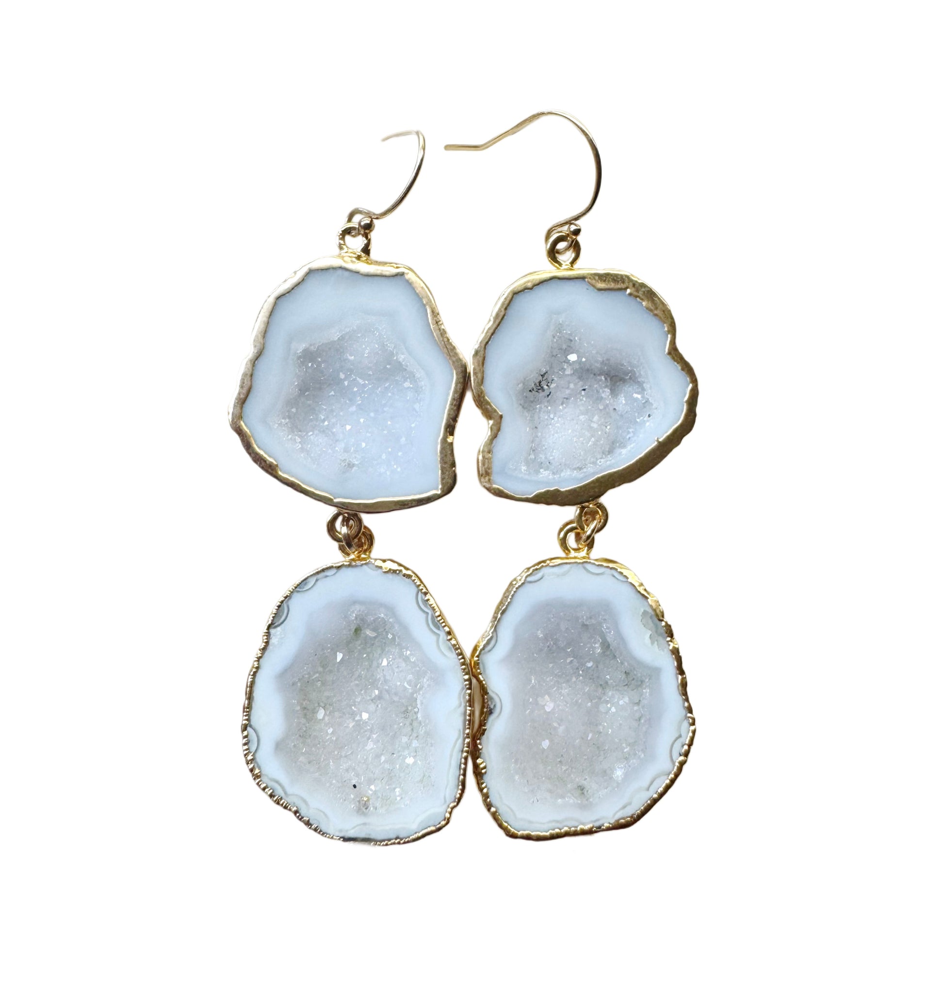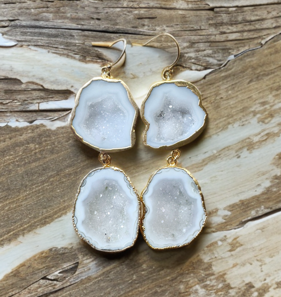 Simple yet captivating, these geode earrings celebrate the raw elegance of natural white stones. With their soft shimmer and organic form, these earrings add quiet sophistication to any look. Whether styled with a crisp blouse or evening gown, they’re your new go-to for effortless modern chic.