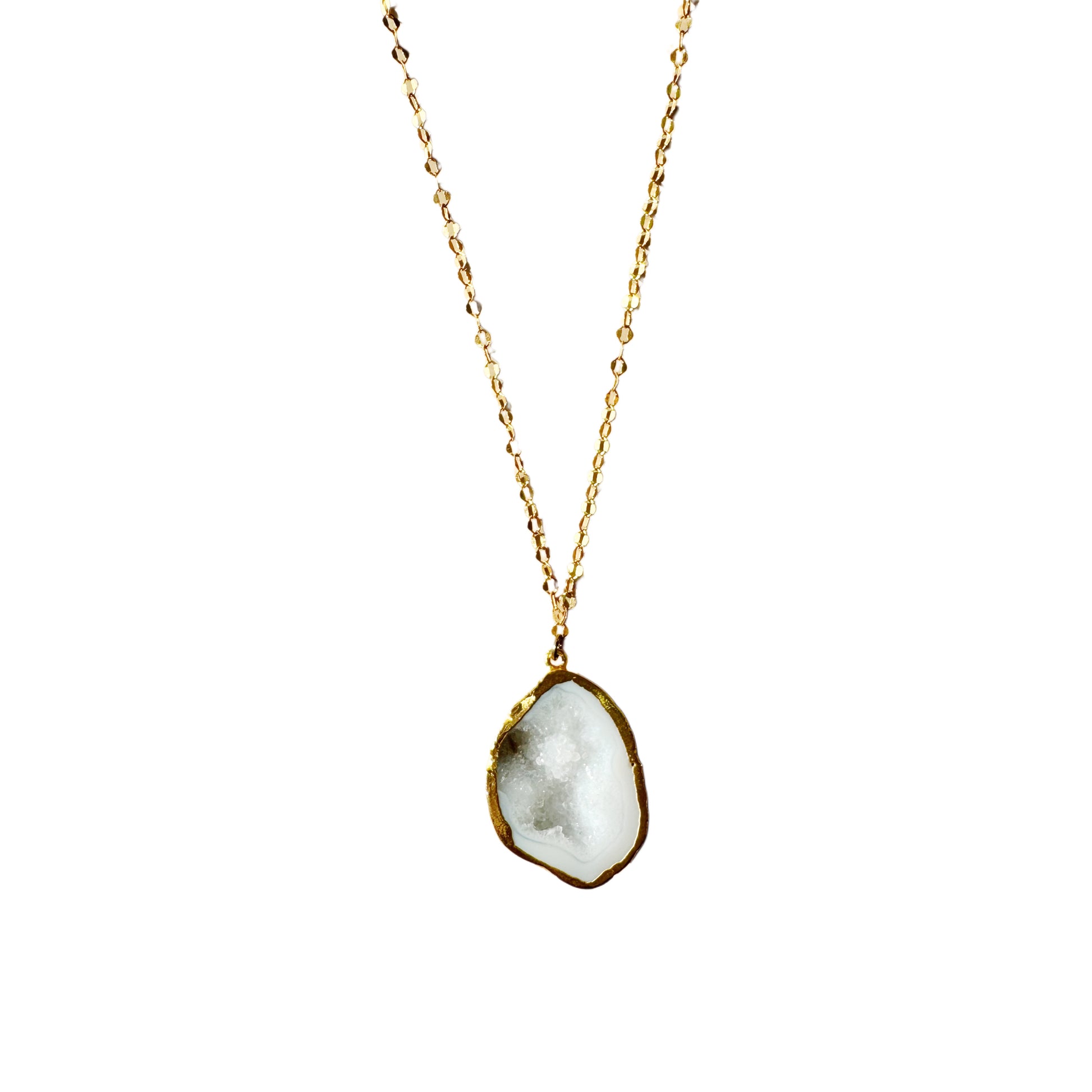 This white geode necklace features a raw, sparkling centerpiece that radiates natural elegance. Perfect for layering or wearing solo, it’s a versatile statement piece for any outfit.