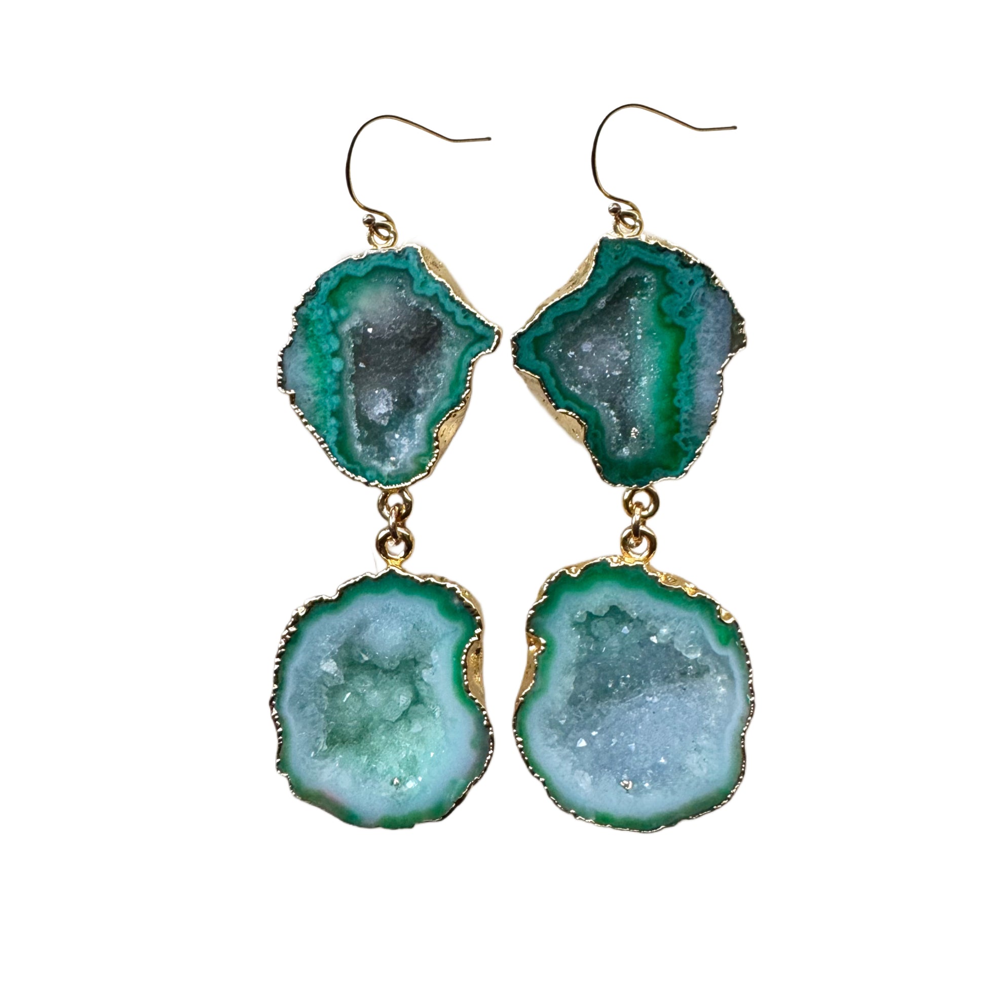 Inspired by lush, tropical hues, these geode drops glow with depth, texture, and crystal sparkle. The organic shapes give them an artful and earthy yet high-fashion feel.