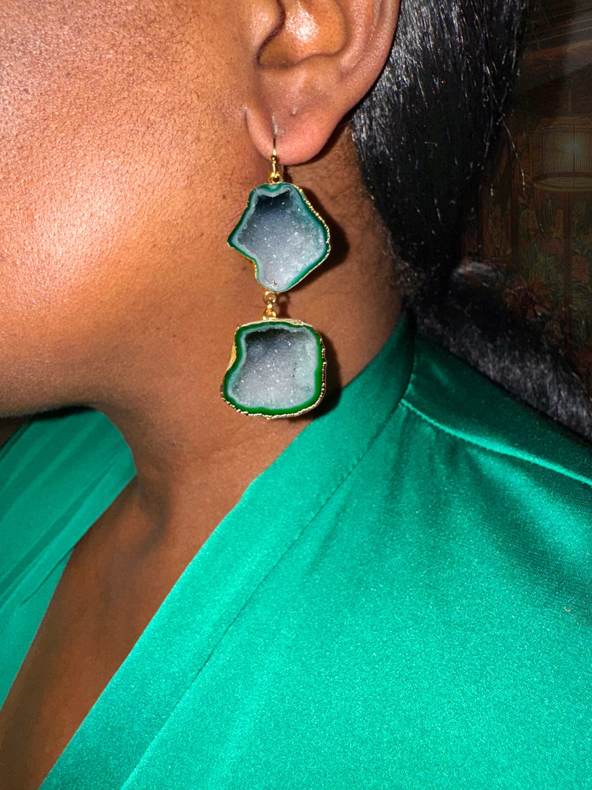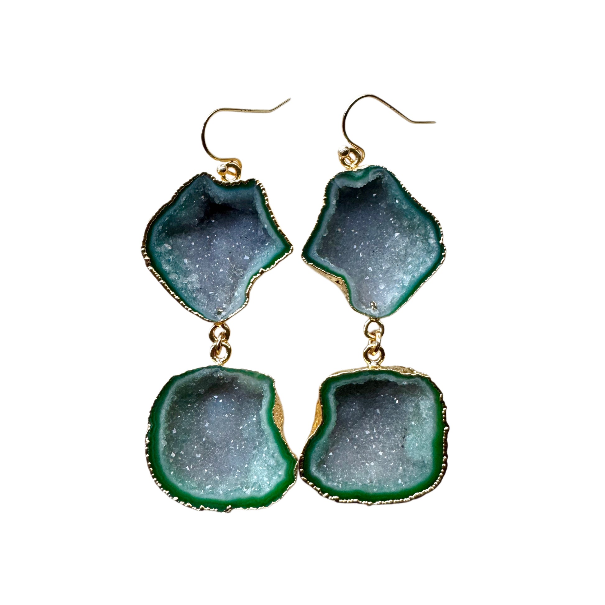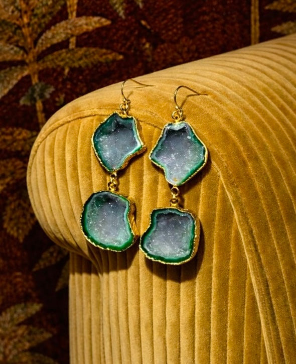 Earthy yet glamorous, these green geode drops catch the light with subtle sparkle and depth. The cool crystal tones paired with warm gold give them a refined, high-fashion feel. Perfect for elevating neutrals or adding drama to an evening look.