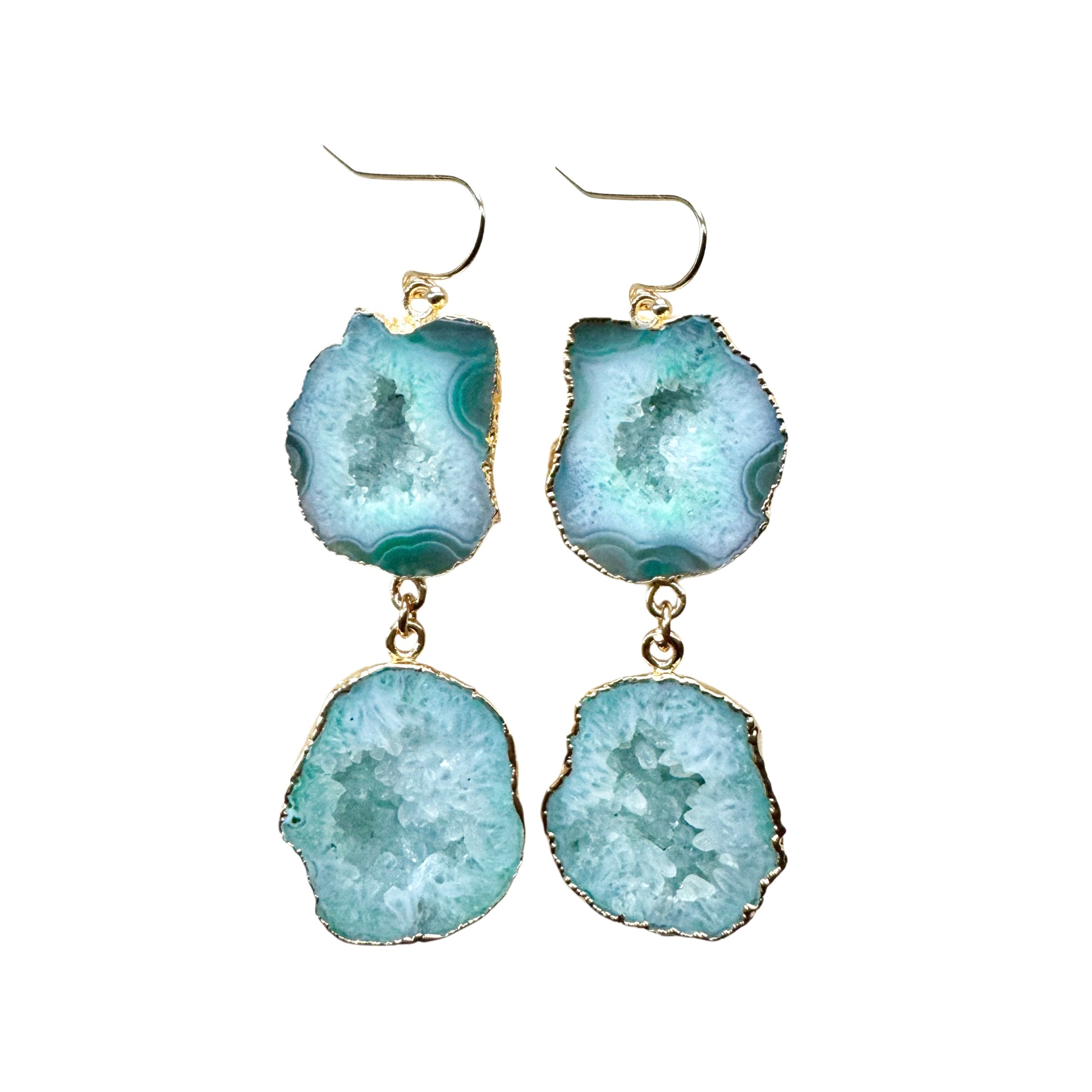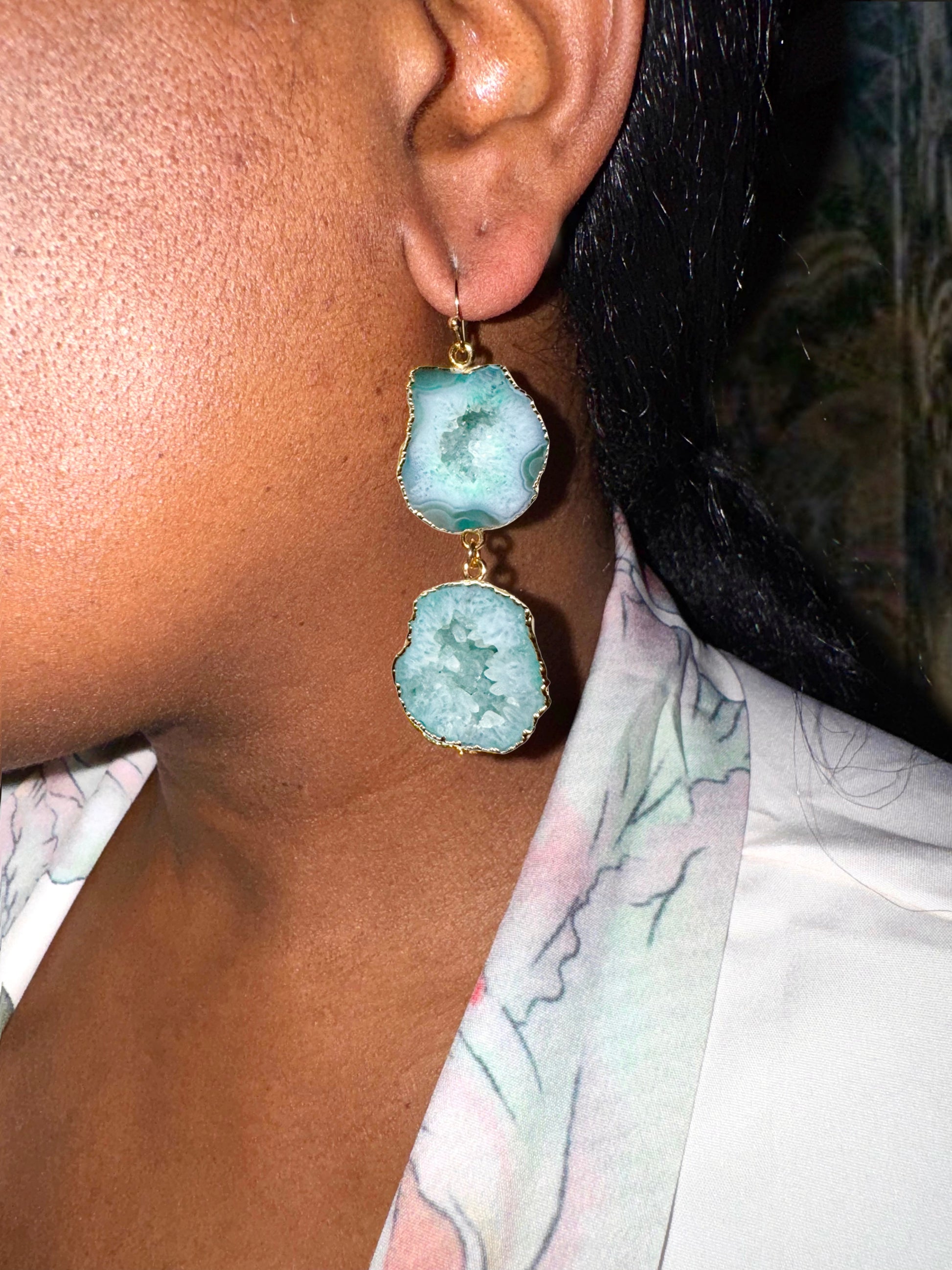These mint green geode earrings feature sparkling druzy centers wrapped in soft seafoam tones and luxe gold edging. The fresh color feels light, modern, and effortlessly chic.