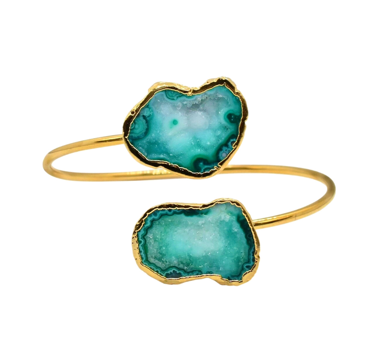 This geode bangle blends raw beauty with refined style. Featuring two striking geode stones in rich green and aqua hues, this piece captures the essence of nature’s artistry. Each stone is unique, showcasing organic textures and shimmering depths. Set on an adjustable band for a comfortable fit, this bracelet adds a touch of effortless sophistication to any outfit, whether you're dressing up or keeping it casual.