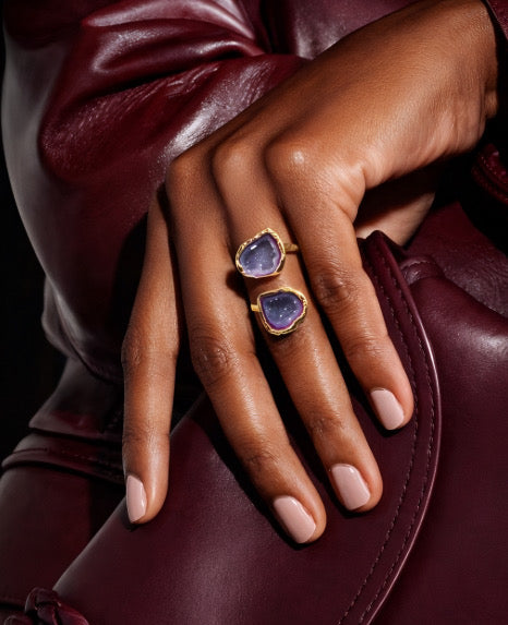 This sculptural statement ring features two rich burgundy geode stones framed in a luminous gold-tone setting and linked by a fluid, open silhouette. Each crystal reveals natural sparkle and organic texture, making every ring uniquely bold and visually striking. Designed for effortless impact, this piece elevates any look with modern glamour.