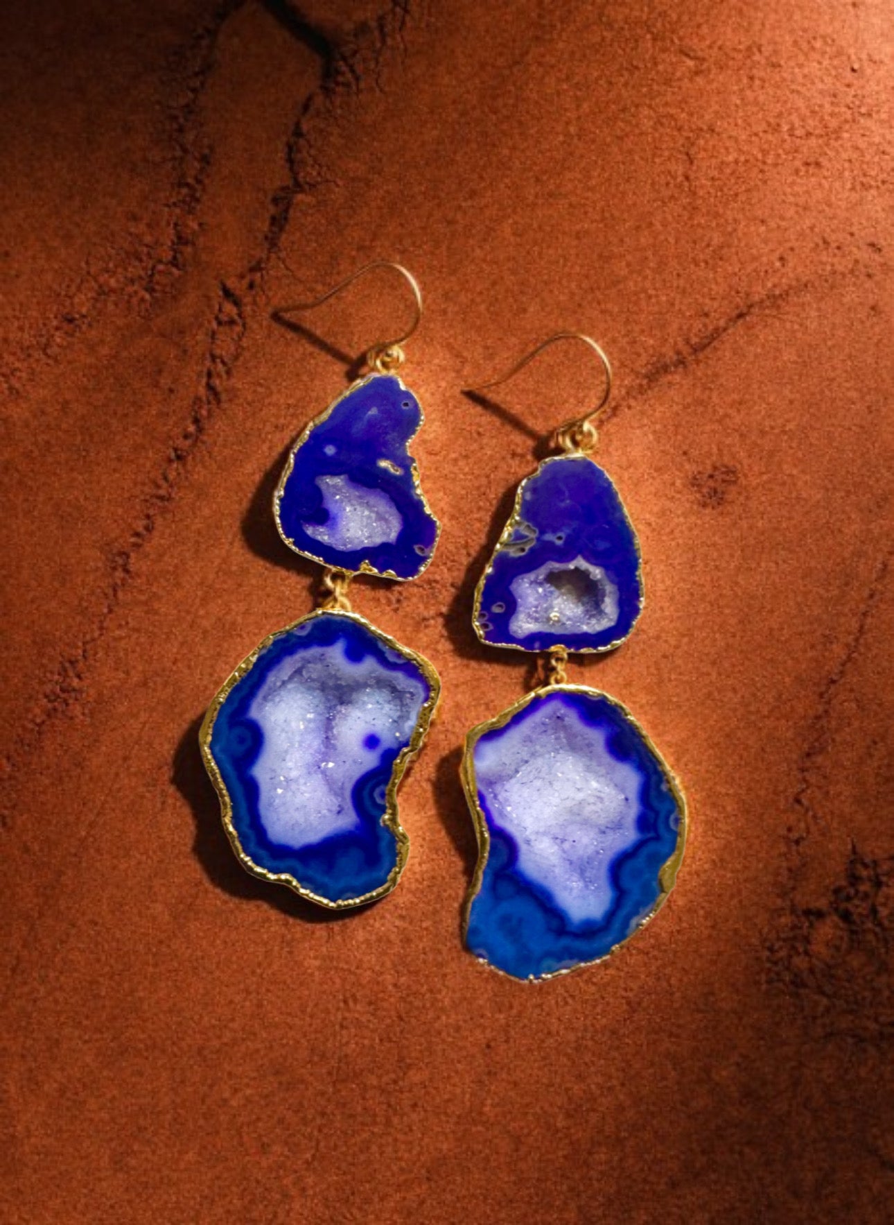 Command attention with the Jasmine geode earrings. Bold, and utterly mesmerizing, the natural geode stones pulse with rich purple energy and grounding indigo depth. Flecked with sparkling mineral textures and dipped in dreamy jewel tones, these earrings bring a striking edge to your look.
