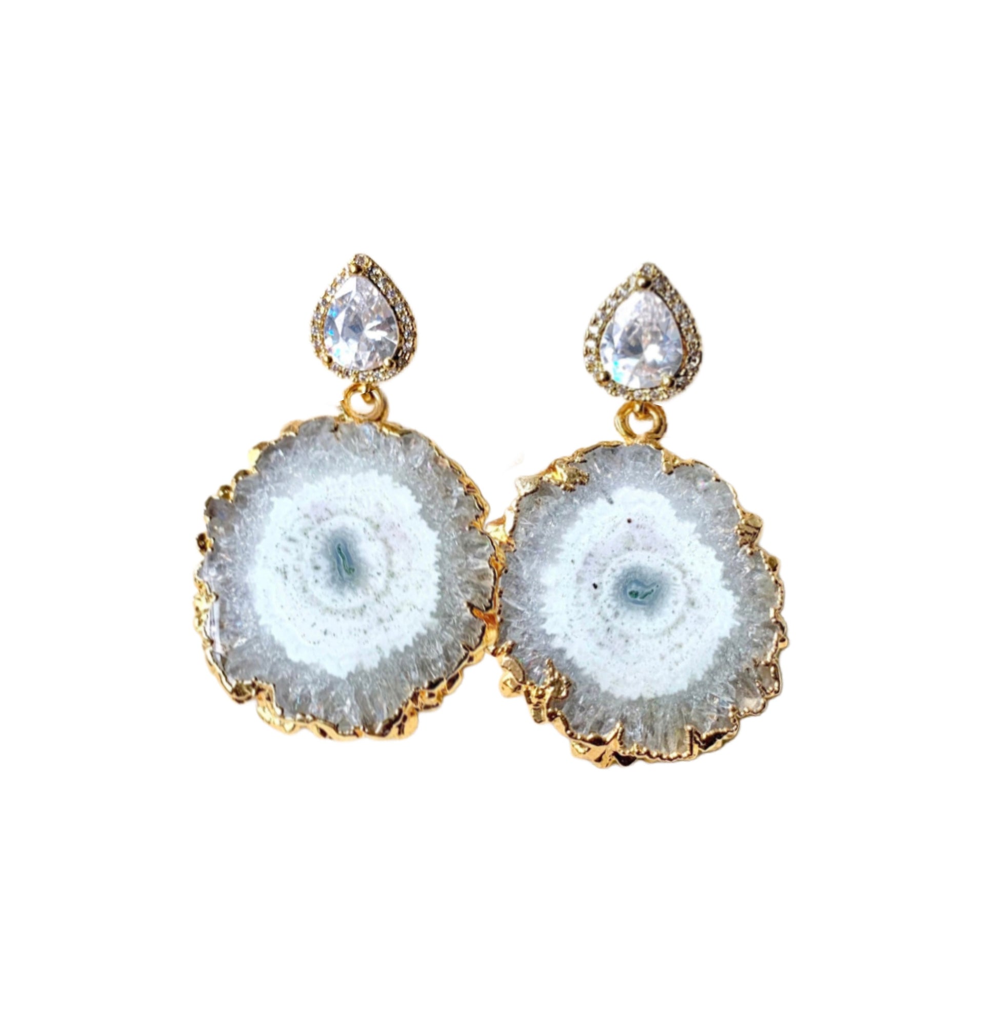 These chic 24k gold-edged solar quartz earrings embody effortless sophistication! The unique grey and white stones are finished with dazzling cz earring posts. They are perfect for dressing up a casual look!