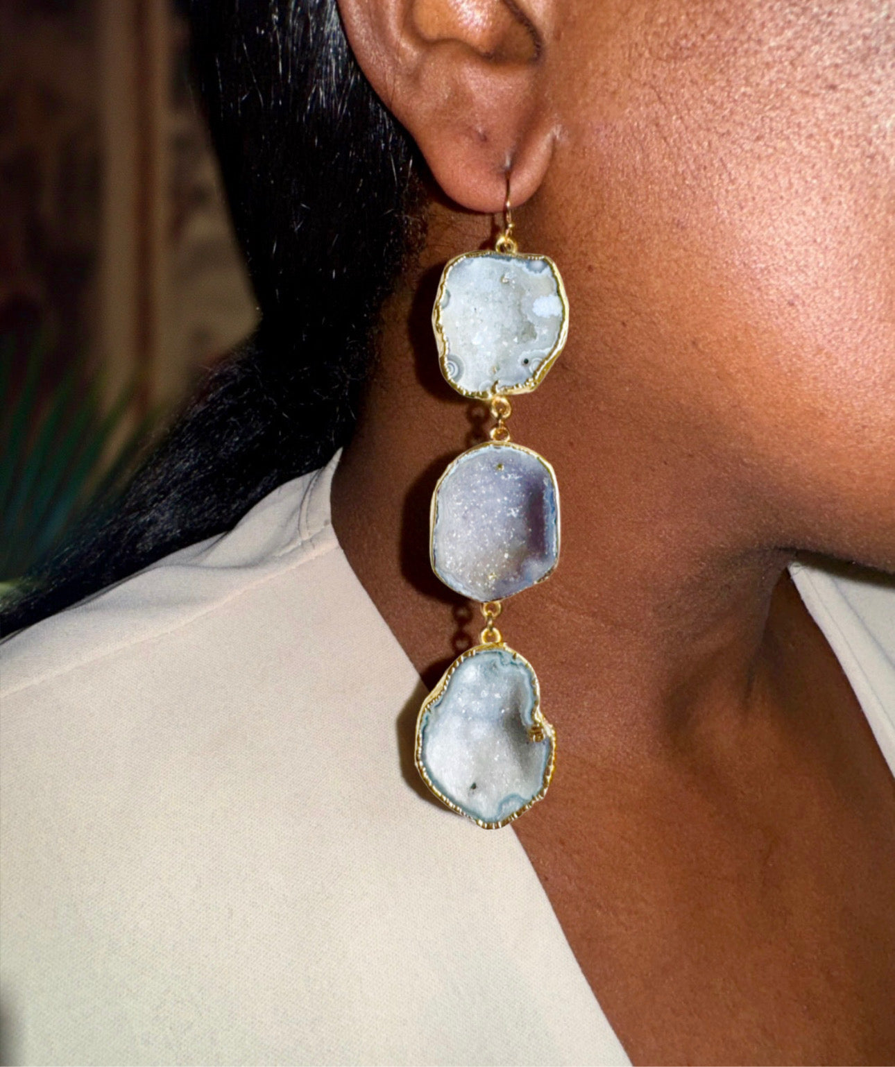 These long geodes earrings pair ethereal off-white tones with muted gray, with each geode centered by a luminous crystal quartz that adds a touch of sparkle. These earrings evoke quiet elegance and an understated, high-fashion bohemian vibe.