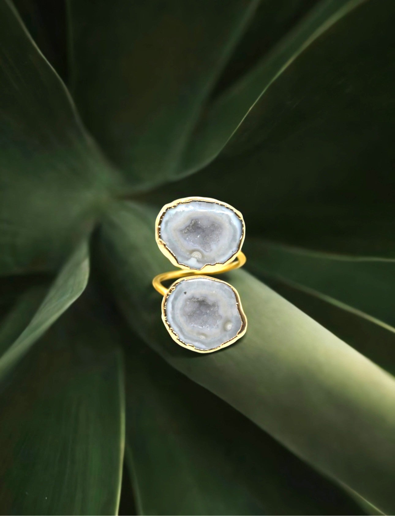 This gray geode ring blends modern edge with natural beauty, featuring a softly layered stone and shimmering crystal center. The organic silhouette is framed in radiant gold, highlighting the subtle depth and movement within the stone. Bold yet neutral, it’s the perfect statement piece to elevate any look with effortless sophistication.