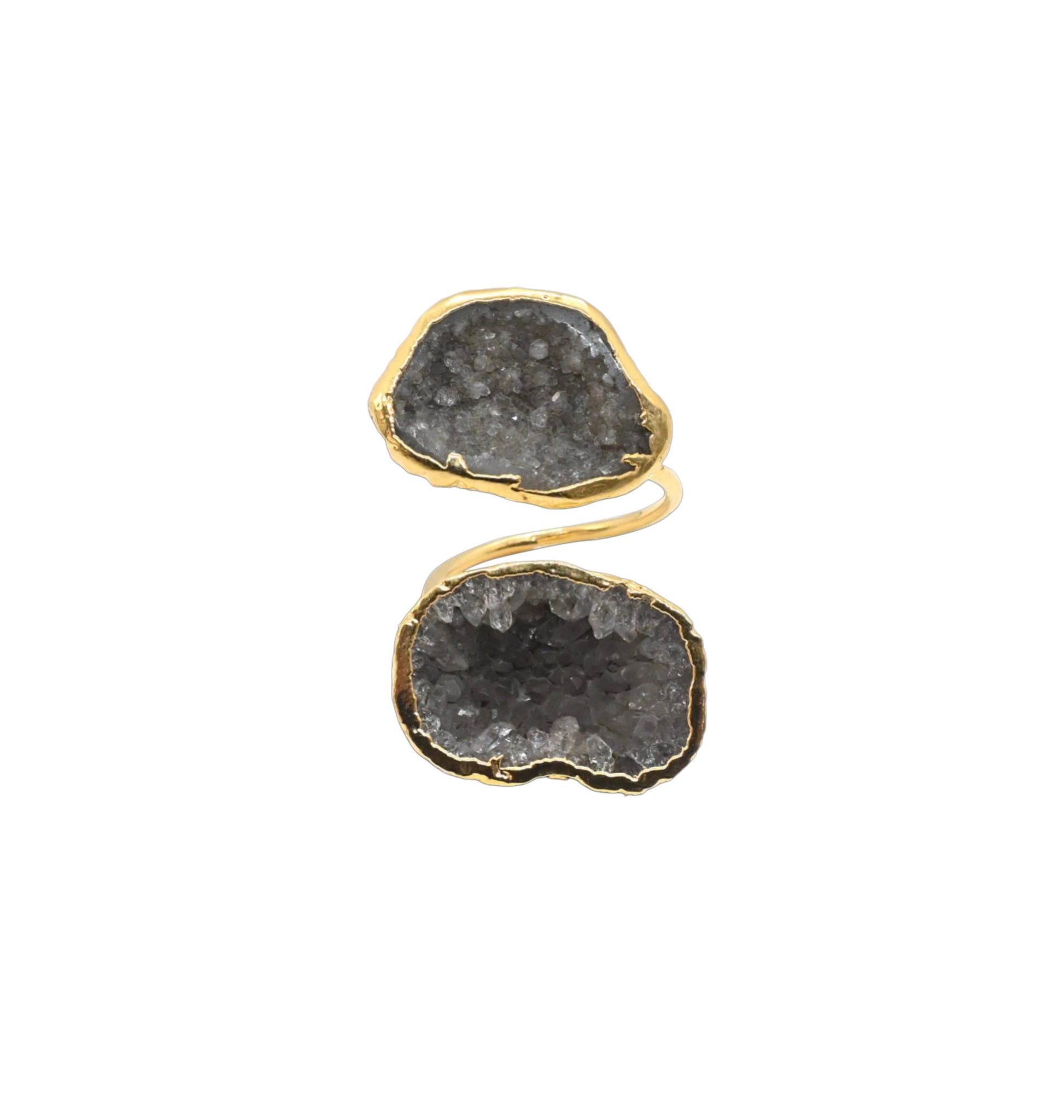 This dark smokey gray geode ring makes a bold, moody statement with its richly textured crystal center and deep charcoal tones. Framed in luminous gold, the organic edges highlight the raw beauty and natural sparkle within the stone. Striking yet sophisticated, it’s the perfect piece to add edge and effortless glamour to your collection.