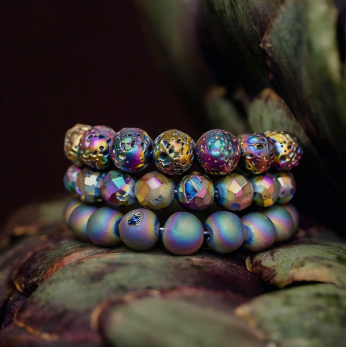 This rainbow titanium druzy and lava stone bead bracelet set shimmers with bold, iridescent crystal textures balanced by soft, matte volcanic stone for a striking contrast. Designed to layer effortlessly, each bracelet brings a modern, high-impact edge to both casual and elevated looks.