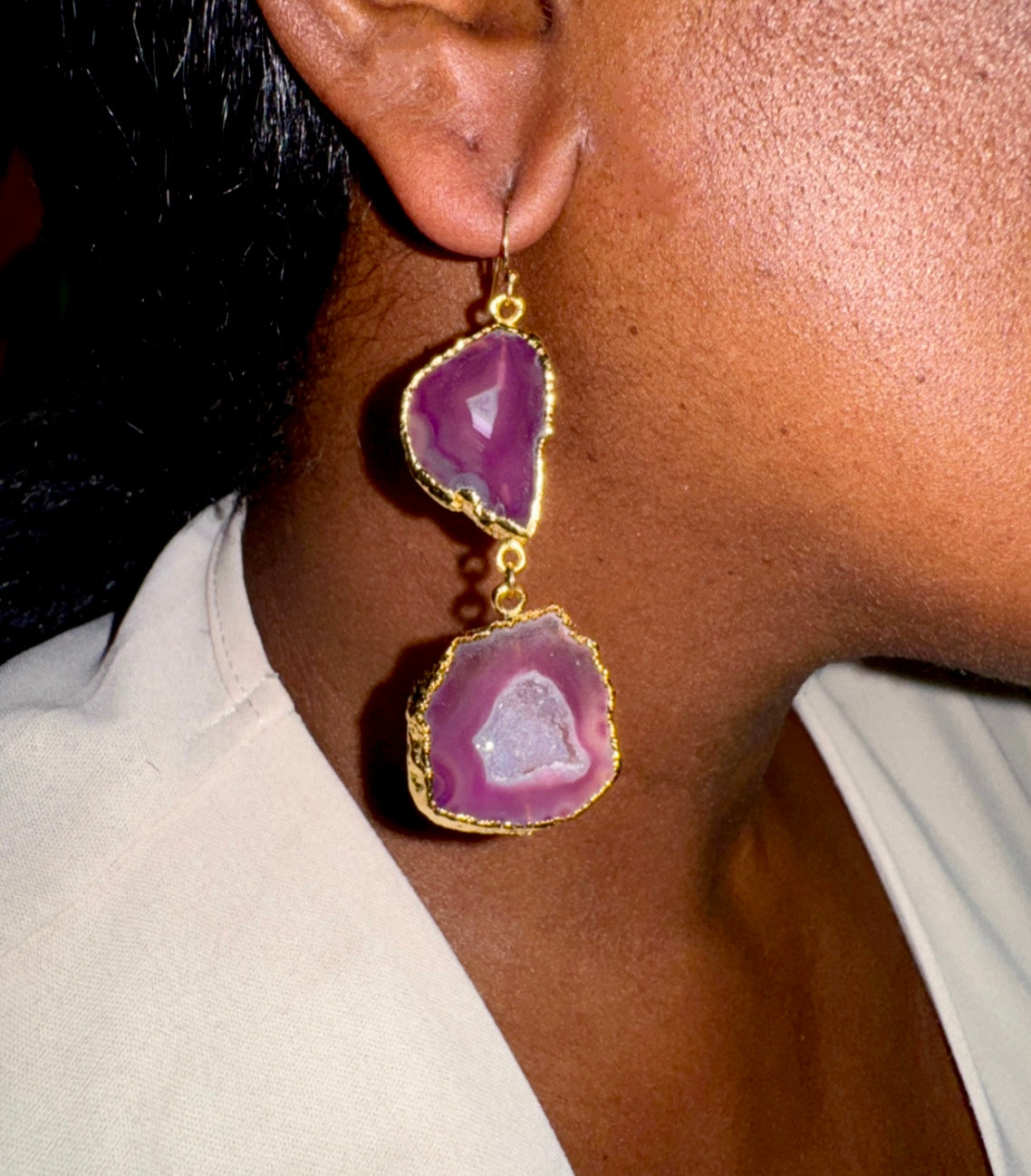 These burgundy geode earrings embody warmth, depth, and effortless sophistication. The rich wine tones and natural crystal texture create a look that feels both earthy and elegant. Framed in gold, they catch the light beautifully and add a hint of bohemian glamour to any outfit.