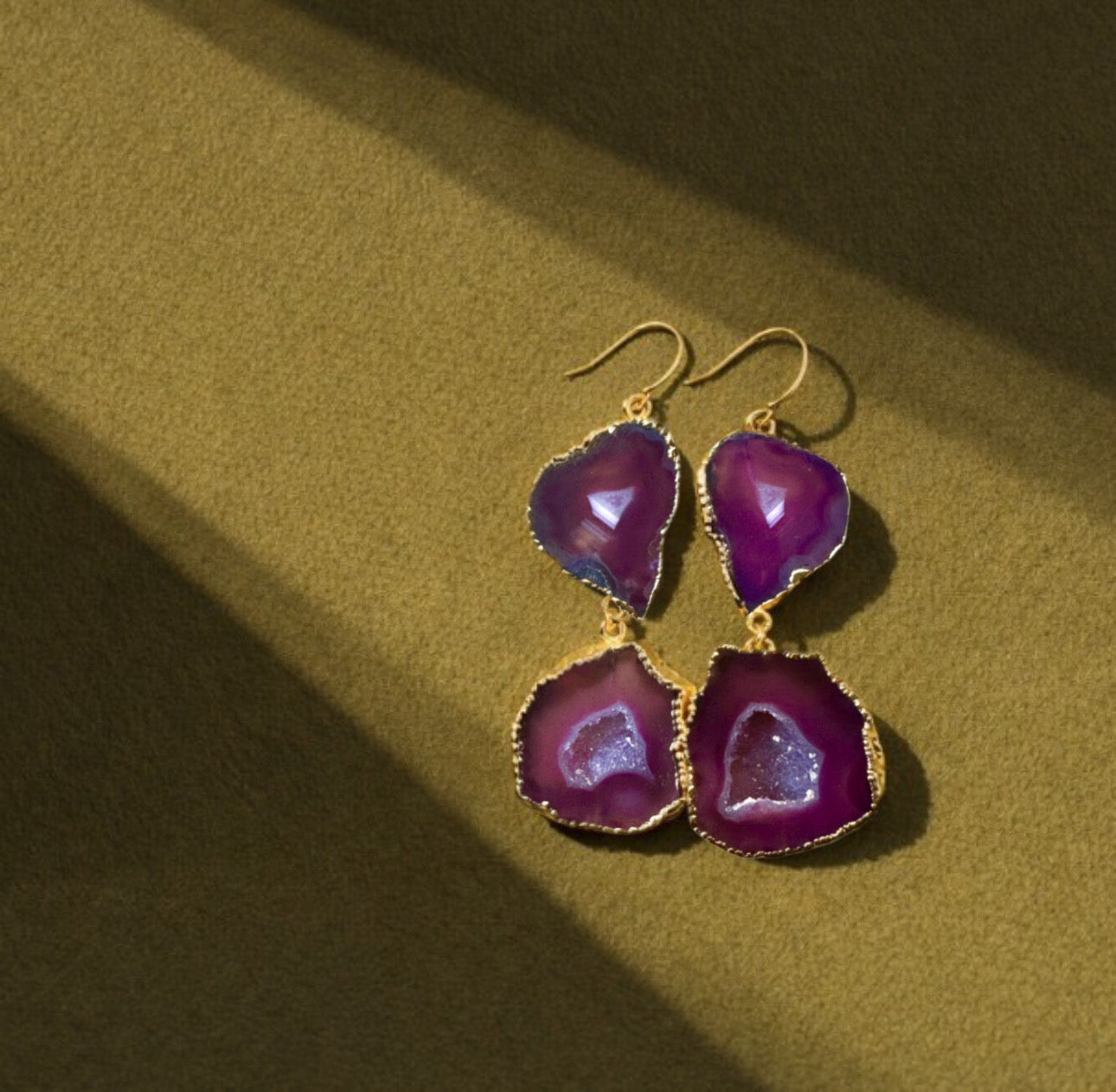 These burgundy geode earrings embody warmth, depth, and effortless sophistication. The rich wine tones and natural crystal texture create a look that feels both earthy and elegant. Framed in gold, they catch the light beautifully and add a hint of bohemian glamour to any outfit.