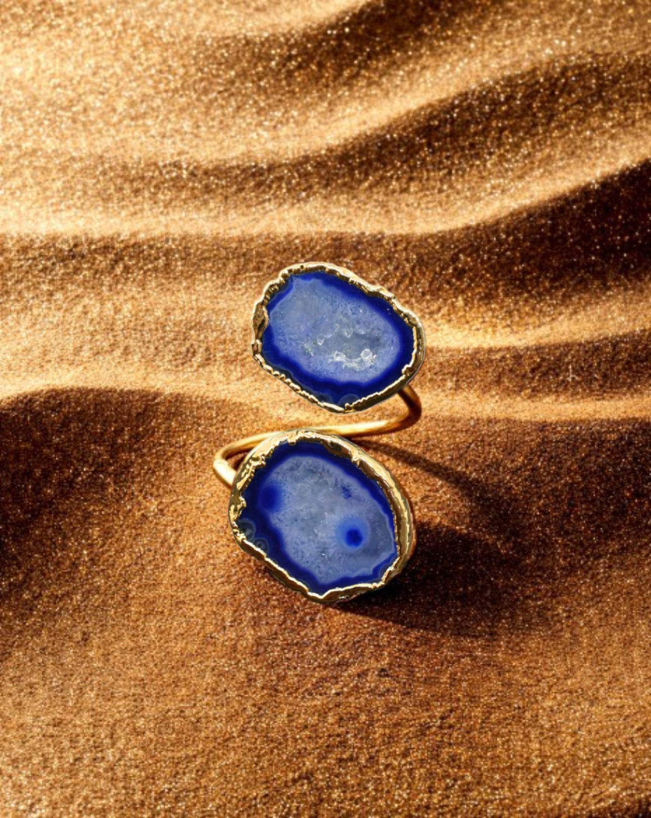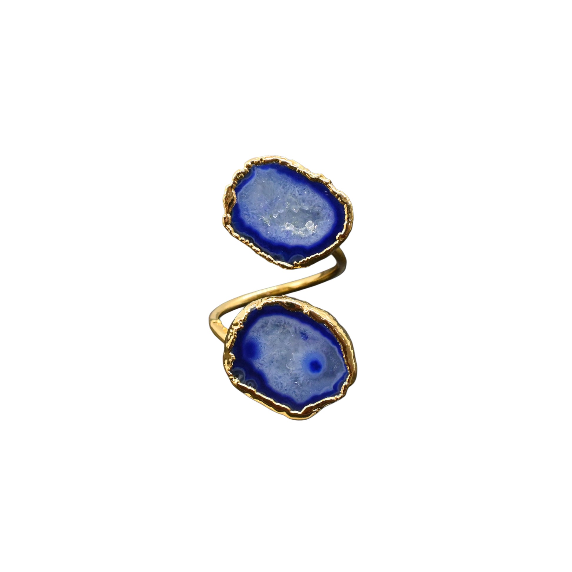 This blue geode ring showcases two sparkling druzy slices framed by deep cobalt banding and finished with luxe gold edging. The open wrap design creates a bold, sculptural look that feels modern and elevated.