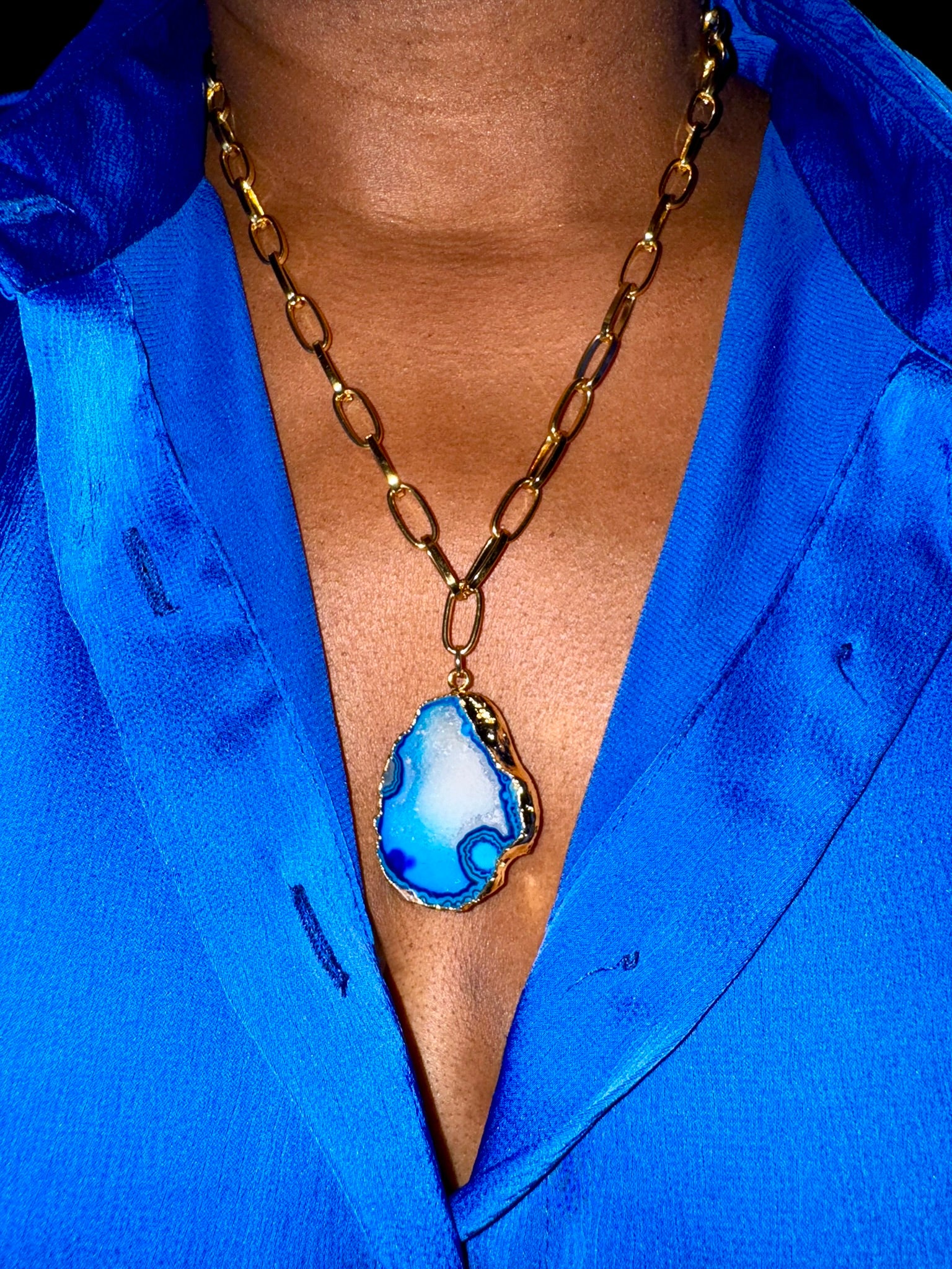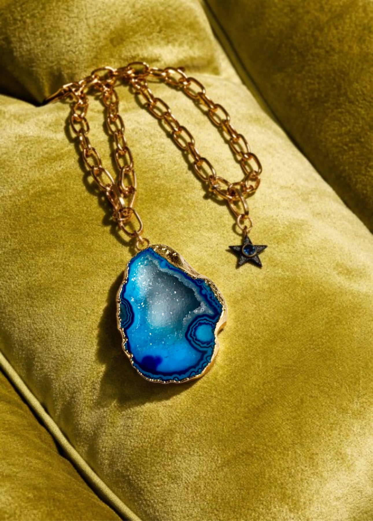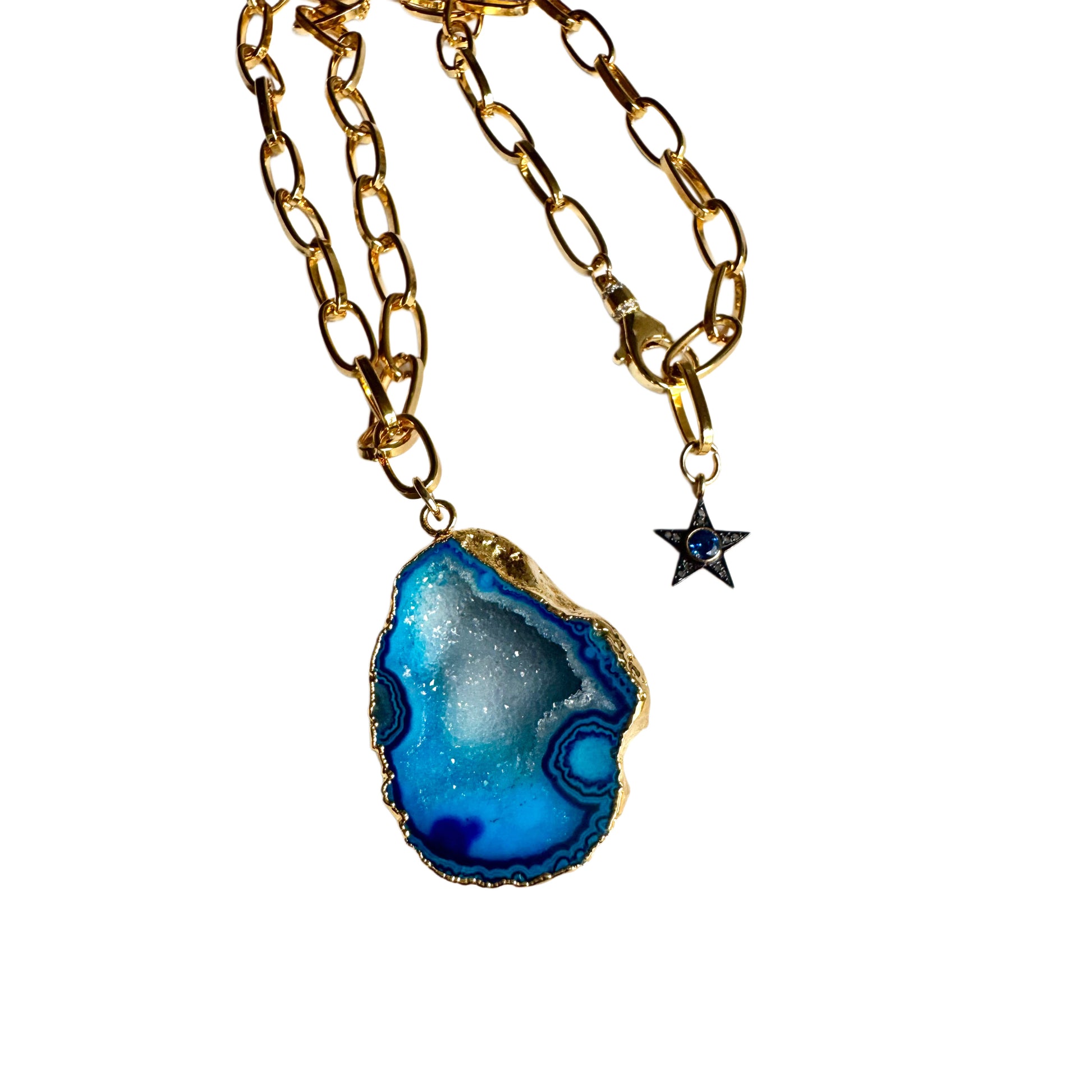 This blue geode statement necklace features a sparkling druzy center framed by rich cobalt banding and luxe gold edging, finished with a pavé sapphire star charm accent for a celestial touch. The bold gold chain adds high-fashion edge and effortless shine.