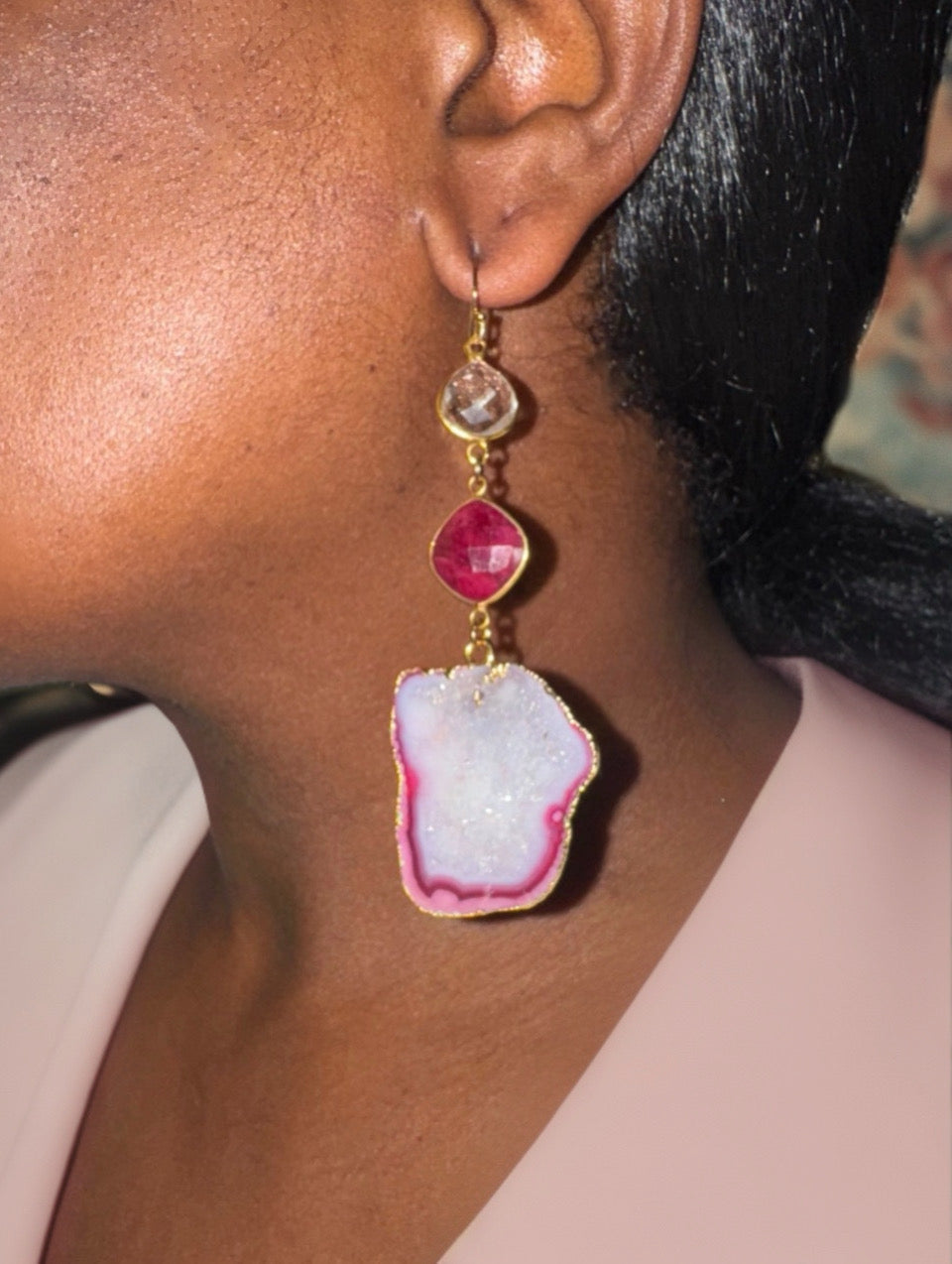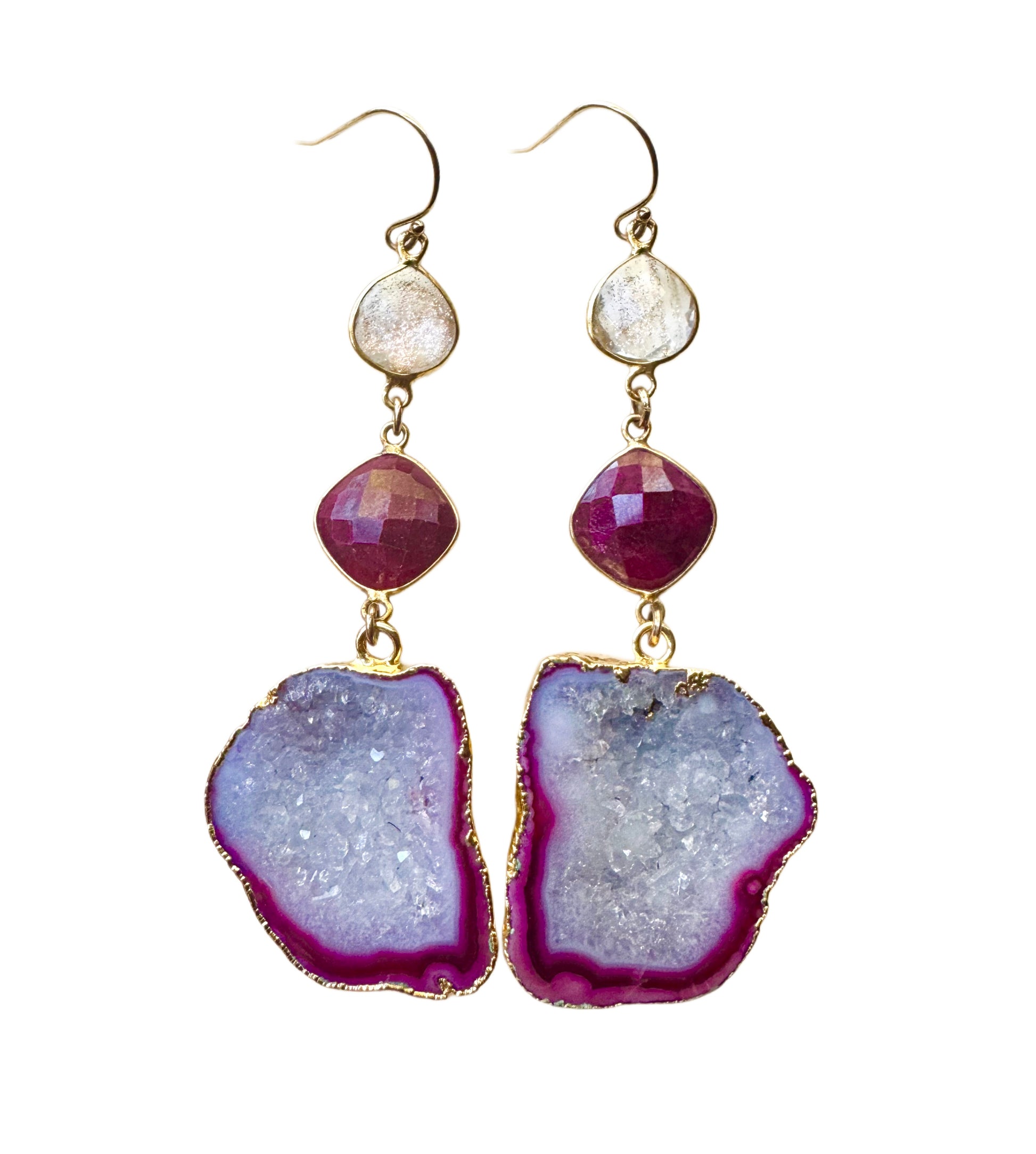 Rich genuine ruby meets organic gray and wine-red geodes and copper-speckled glass connectors in a striking composition that feels both grounded and glamorous. These earrings are perfect for the woman who loves bold, soulful jewelry with a bohemian flair.