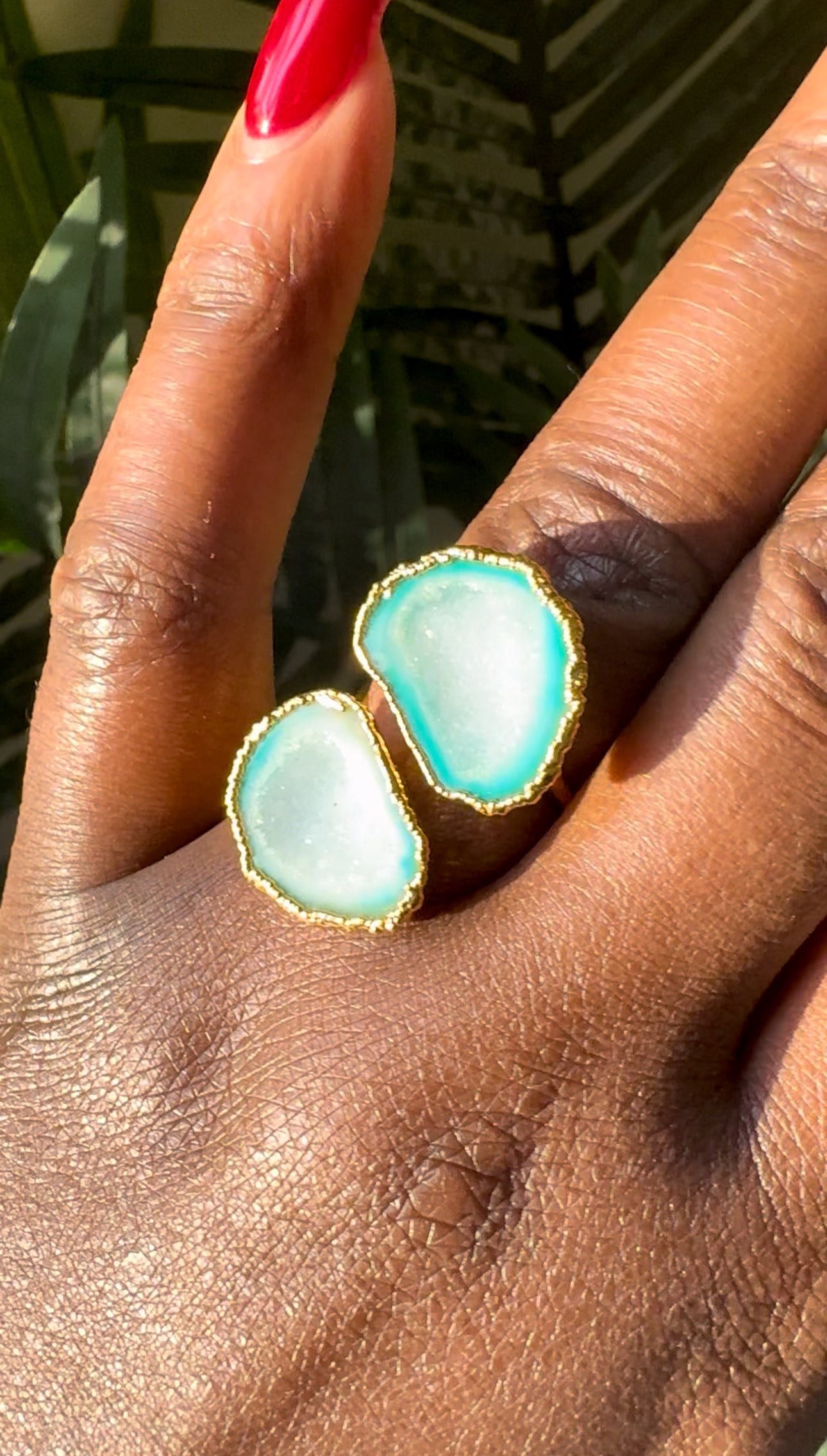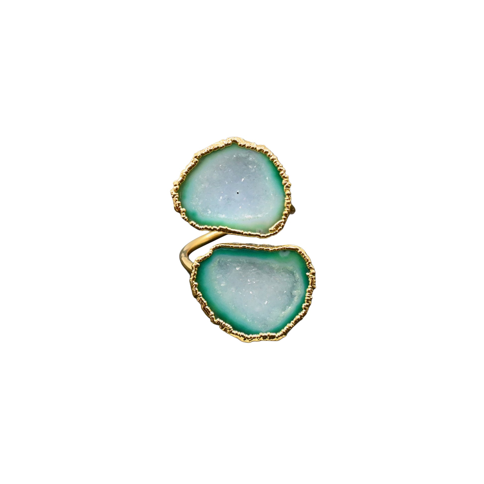 This green geode ring features a sparkling druzy center and luxe gold edging in a stunning double-stone design. The open silhouette feels modern, bold, and effortlessly chic.